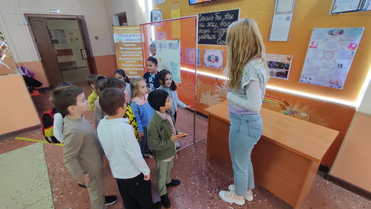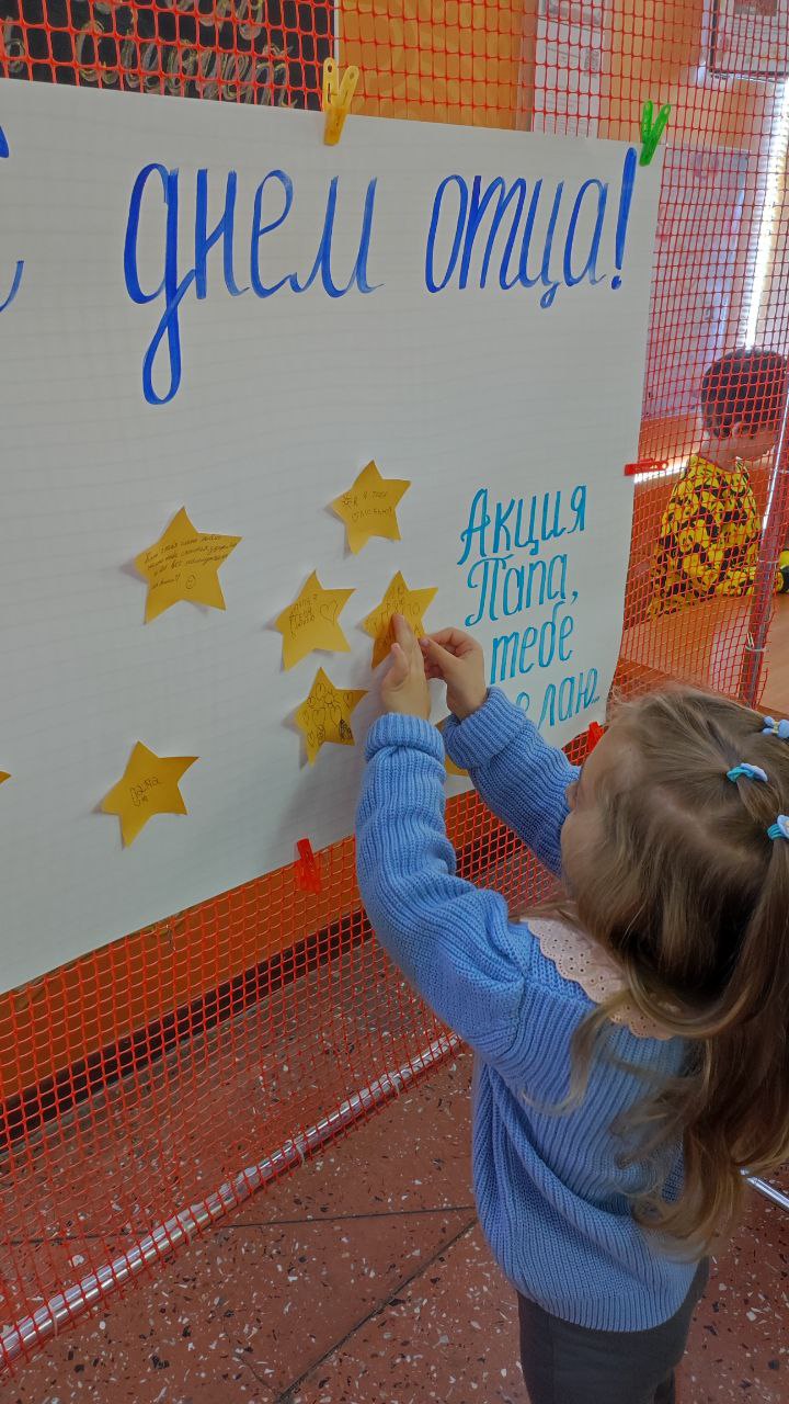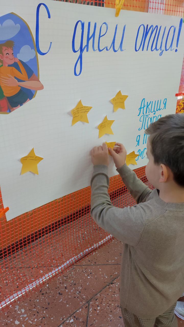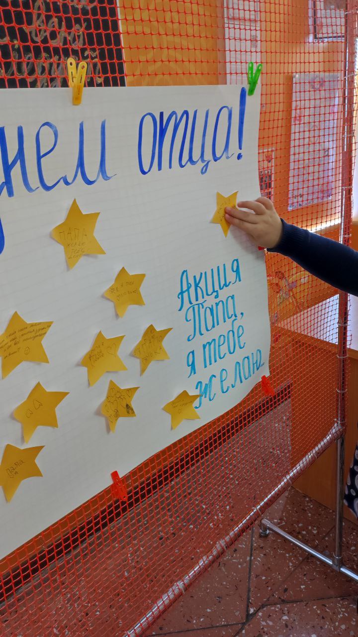 Дворец детского творчества старается приобщить этот праздник среди новых поколений. И сегодня для детей была проведена акция: «Папа, я тебе желаю». Ребята писали свои пожелания на «звездочках» и приклеивали их на общий плакат.